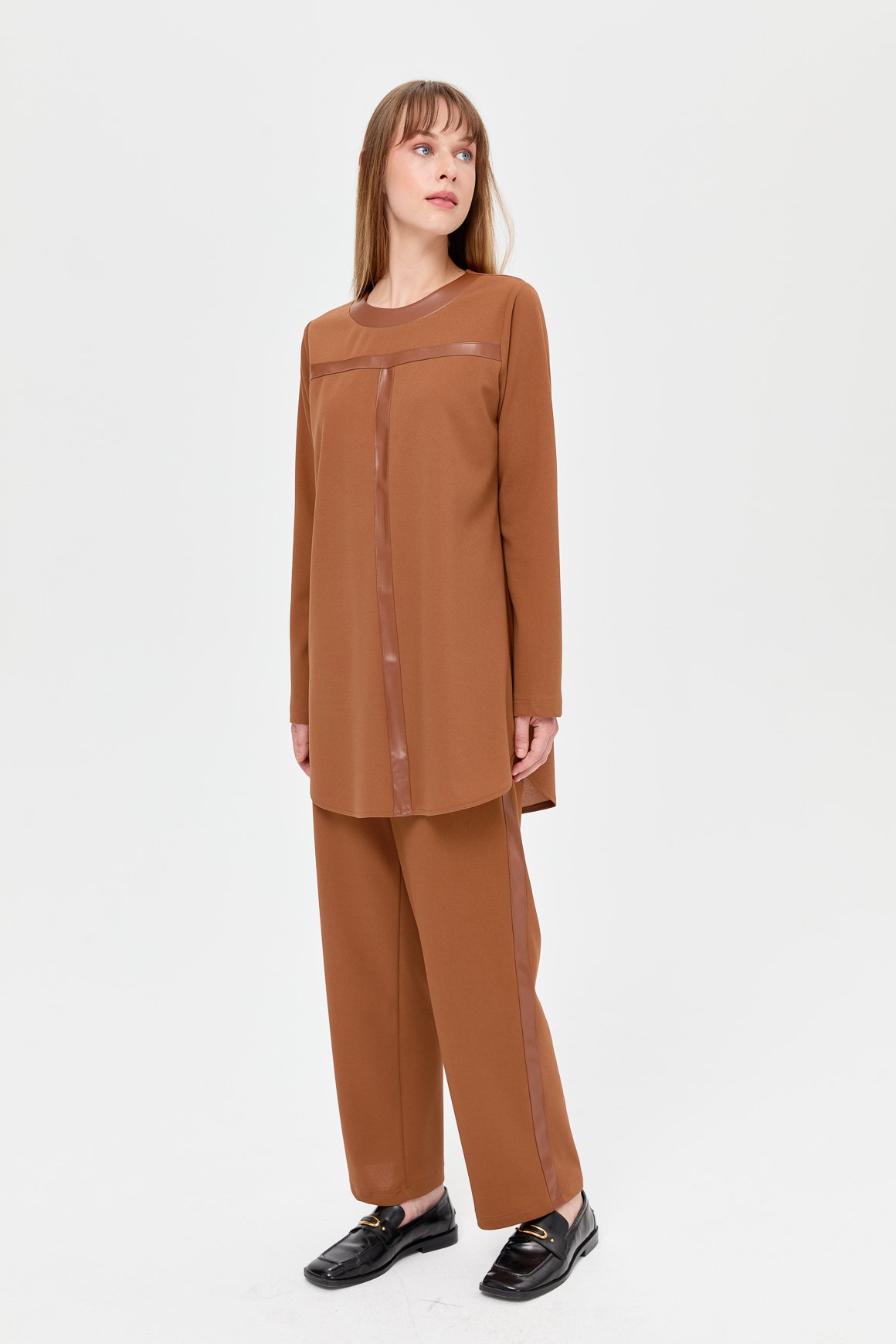 Deri Detaylı Krep Pantolonlu Takım  Taba