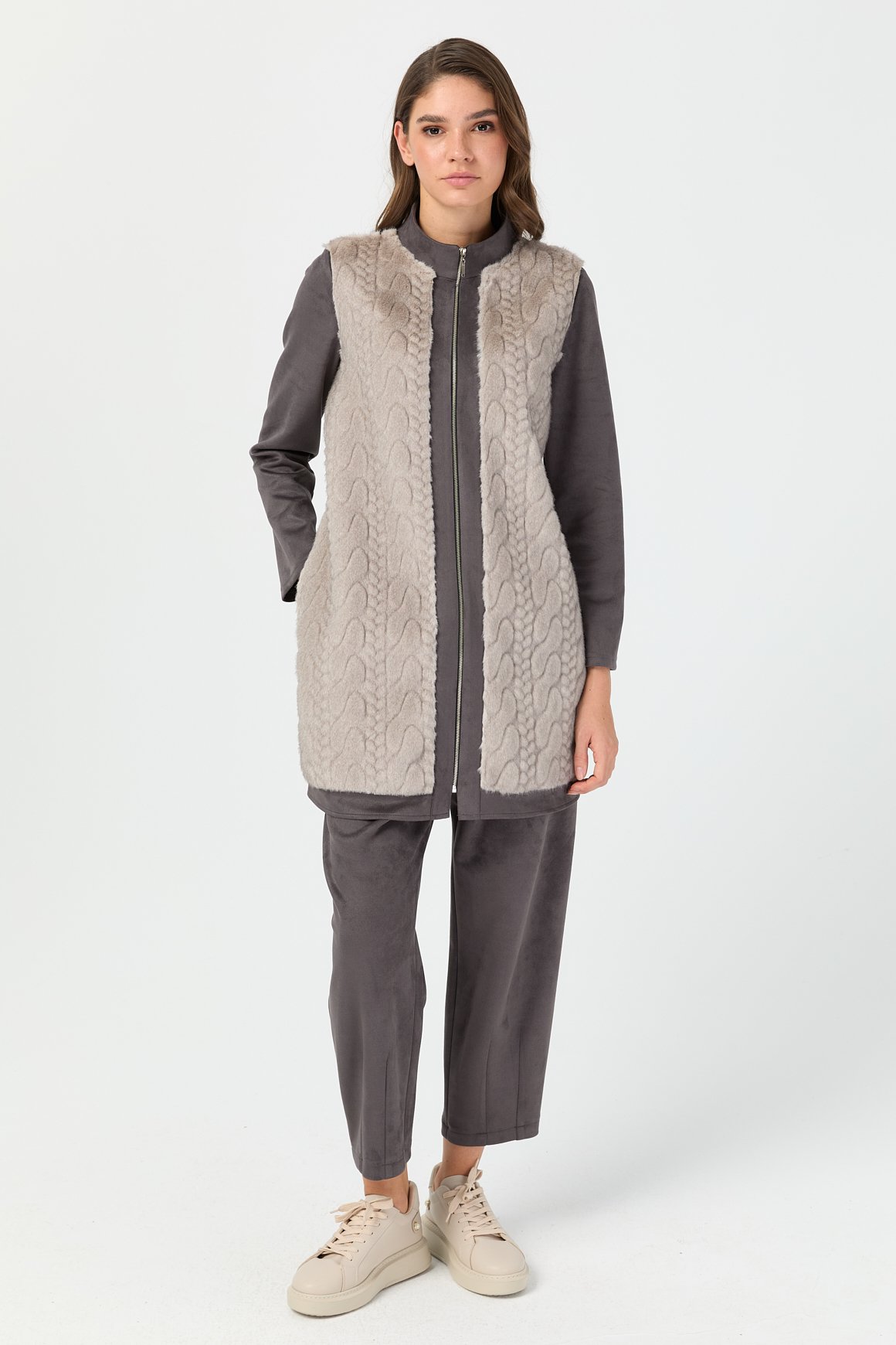 Saç Örgülü Kürk Detaylı Ceket Gri (2624435201)