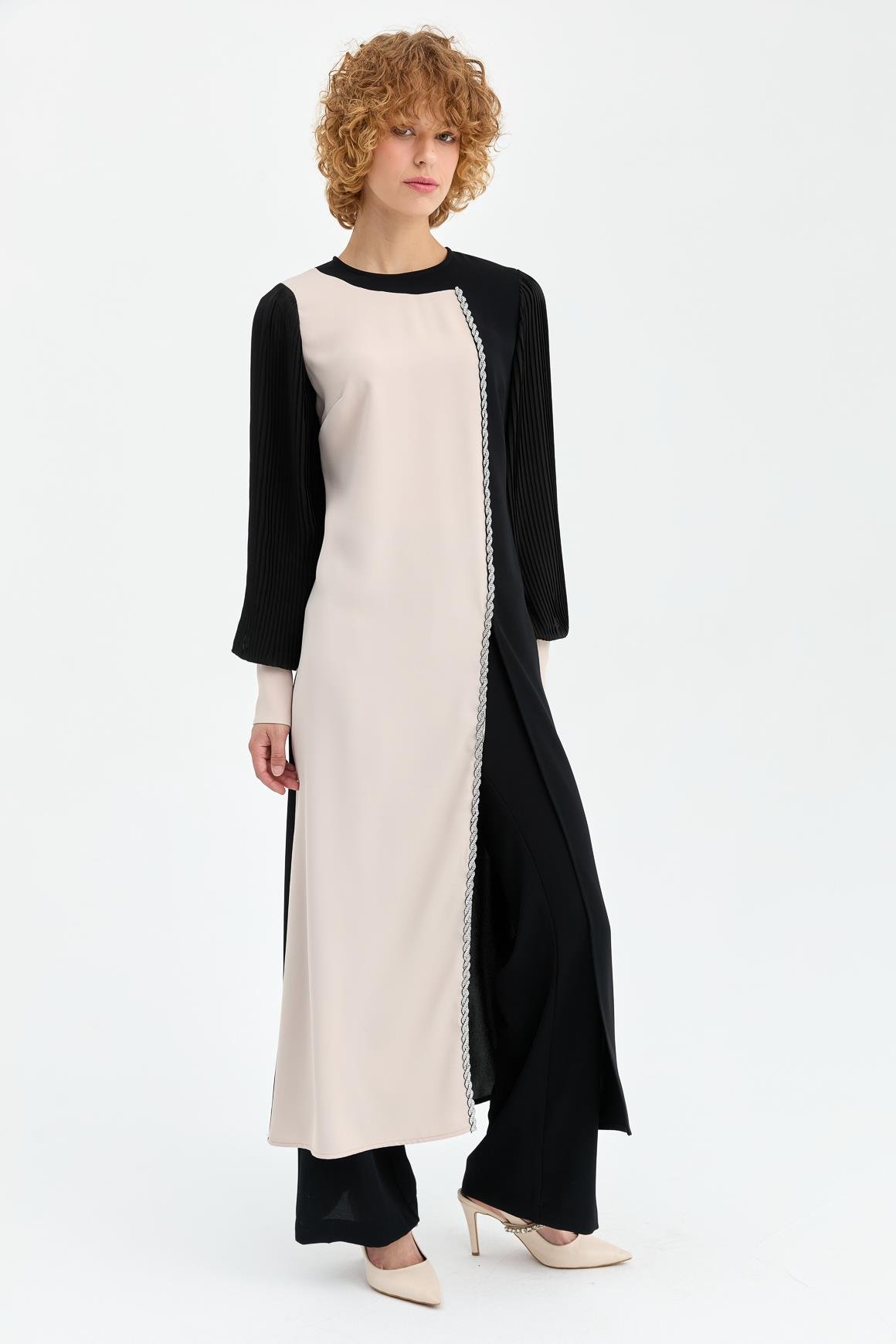 Kolu Piliseli Önden Yırtmaçlı Şerit Taş Detaylı Pantolonlu Takım  Bej
