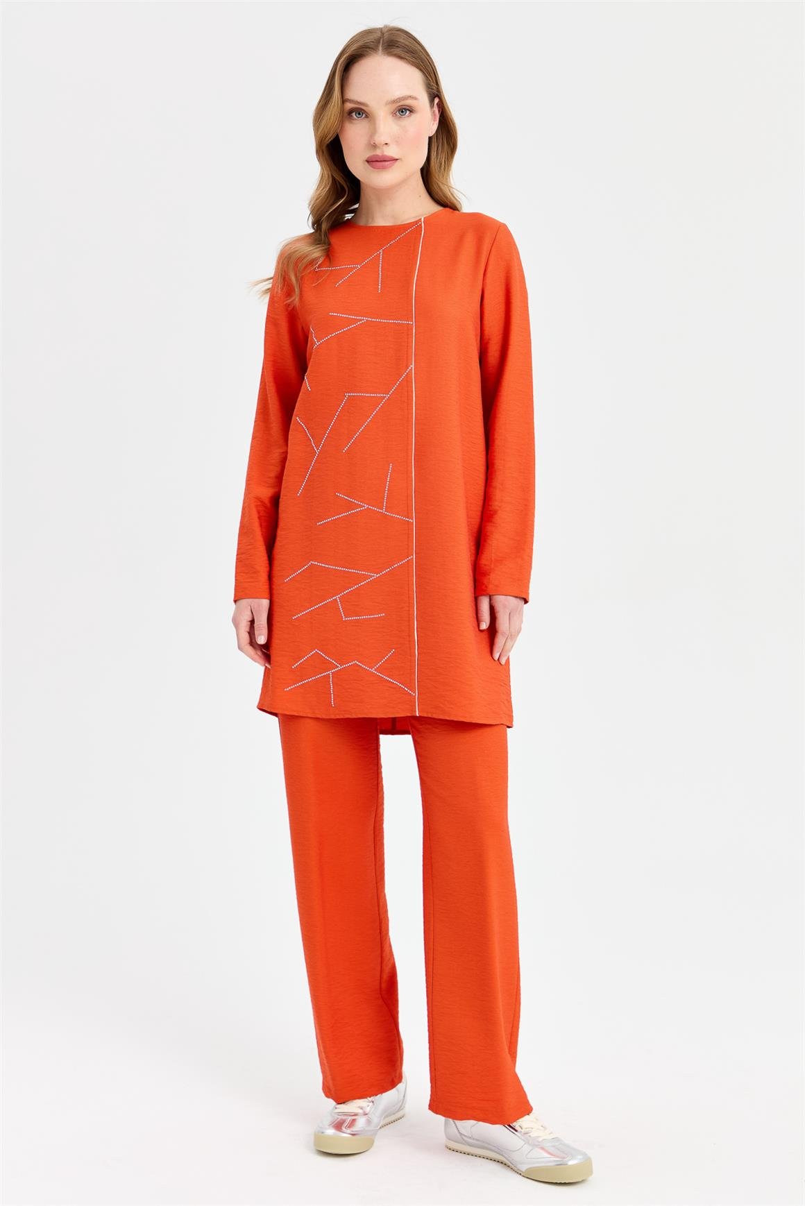 Önü Taş Yapıştırmalı Pantolon Tunik Takım Oranj (2317437104)